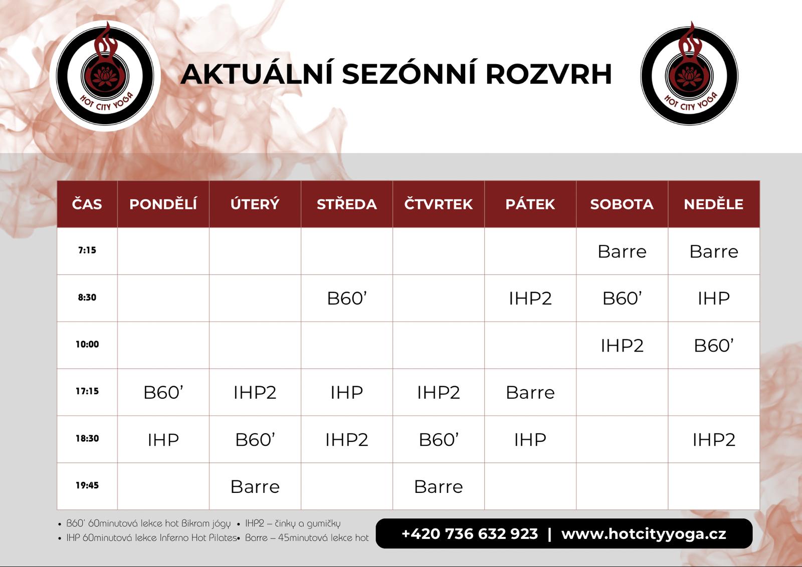 Pro nejvýhodnější kombinaci lekcí doporučujeme pořídit časovou permanentku. Balíčky lekci např. 10, 20, 50 lekcí je možno použít na 60ti min. lekce + IHP + IHP2 + Barre. Dostavte se 20 minut předem. Všechny nezbytné informace najdete v odkaze: O hot józe - první lekce. Studio se otevírá 30 minut před lekcí a zavírá 30 minut po lekci. Mimo časy lekcí je studio zavřené. V průběhu lekce je studio zavřené.